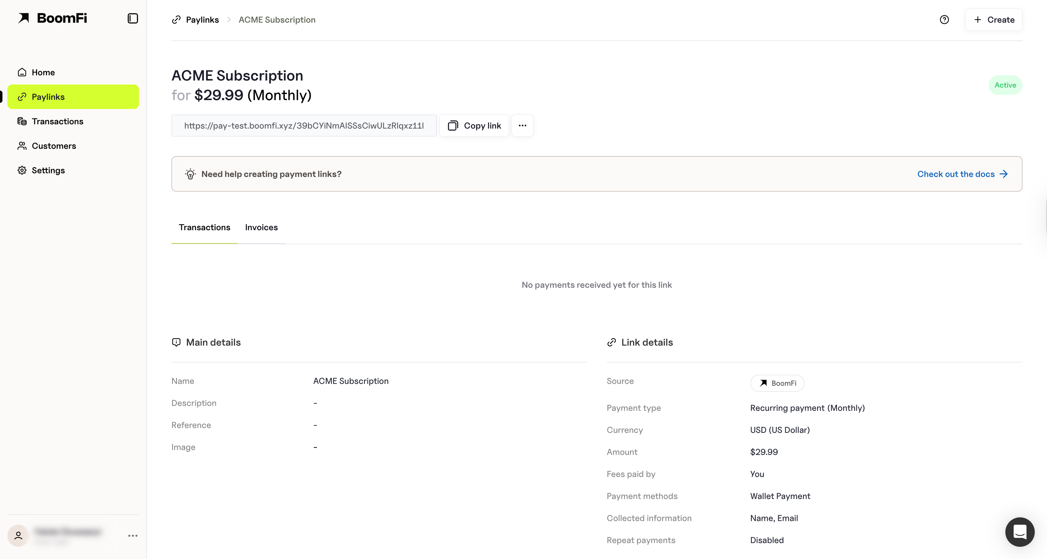 BoomFi's dashboard allows you to efficiently manage your Pay Links. Here’s what you can find: