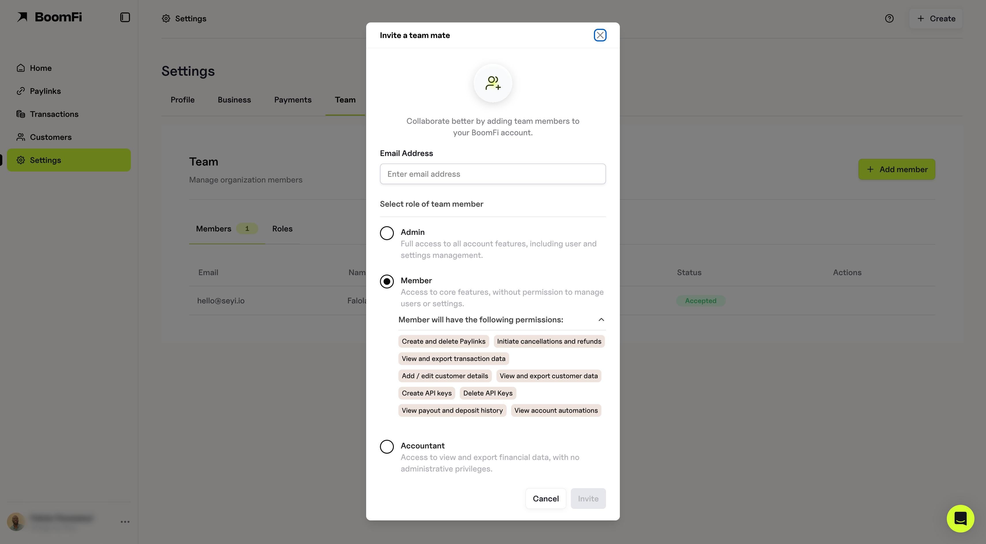 - Member: Authorized to create and manage pay links, view, and export customer/transaction data, and initiate refunds or cancellations.